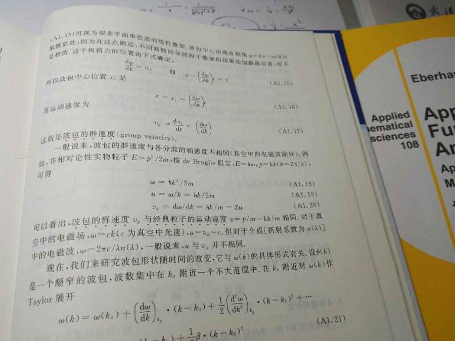 假如一些波进行叠加,往往会形成一些波包,就是用面把波的极大值,极小值包裹起来,群速度就是这个包络面的速度,相速度就是波本身的相位叠加速度。数学上群速为dw/dk,相速度就是w/k 发自小木虫Android客户端 |