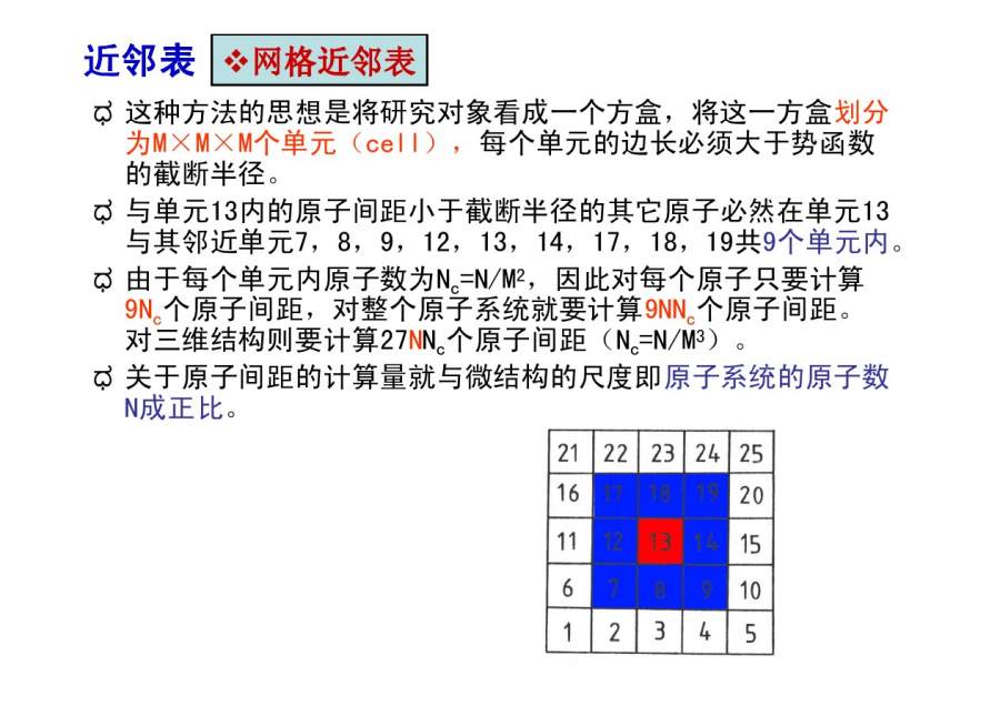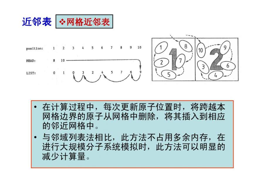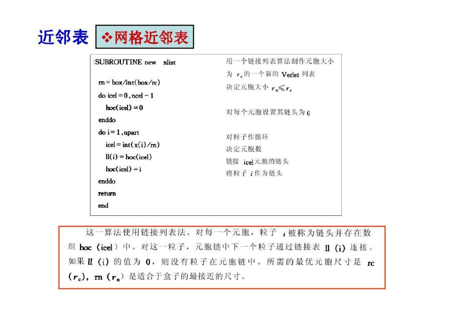 最近在看Frenkel的那本分子模拟的书,在看采用列表法对计算力进行加速的时候,不是很明白。 图片是关于元胞列表法的一些介绍,我知道基本思路是姜模拟盒子分成若干个小元胞(cell),然后计算粒子i与这些元胞中粒子的相互作用。 可不是很理解在编程过程中需要的两个一维数组 Head和List,按照图片所示, Head是对应的元胞中序号最大的粒子么?那List是怎么将粒子链接起来的呢? |