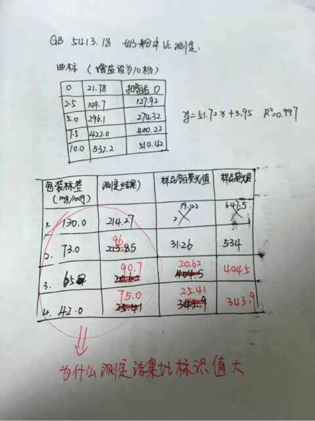 不好意思因为发了站内信给你你没回复,我以为帖子你也没回复呢,今天才发现==最近做实验也解决了一些问题,但是重现性也不太好,感觉每次册的标曲都有些差别,代入测定的VC荧光值后浓度有一定差别。 现在有个问题是我们根据测得数据计算的VC值与包装成分表上写的小得多,而你是偏大,所以我想问问你根据GB里的公式计算的时候,公式里的定容体积V和试样稀释倍数f是按多少算的?我一直怀疑是这些参数的原因,刚拆封的奶粉测出来的怎么会跟包装上差那么多呢 ![]() (包装上写的49.7 mg/100g,我们测的基本上就是32左右,而且储存了一两个月的奶粉VC测定值跟刚拆封的差别只有2左右,按理来说VC氧化应该不会这么慢,所以想跟你探讨一下看看有没有类似问题) 希望能尽快得到回复,万分感谢!!! |