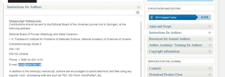 请问Powder metallurgy and metal ceramics这个杂志怎么投稿啊?只找到一个网址https://www.springer.com/materia ... ation/journal/11106,也找不到投稿处,没有submit online,只找到一个编辑邮箱publ@ipms.kiev.ua。这怎么投稿啊,敢投稿吗?![]() ![]() ![]() QQ截图20160516123058.png |