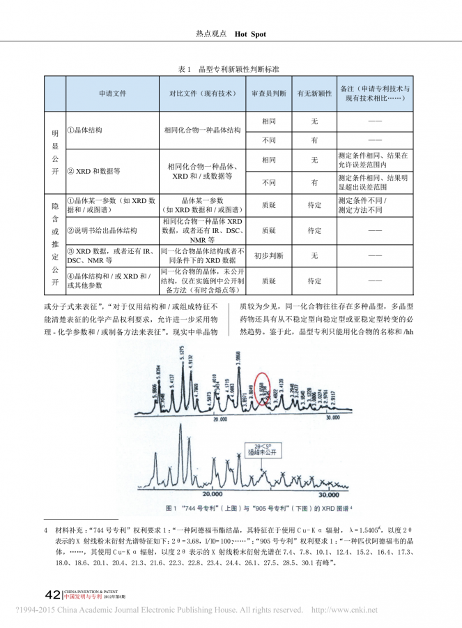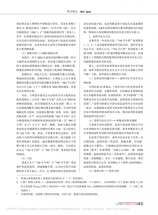 yang5536 同学 http://muchong.com/bbs/viewthread.php?tid=10308407&fpage=1 “印象最深的一个专利纠纷案例就是江苏正大天晴与天津药物研究院的晶型之争。最终的结果就是天津药物研究院的专利维持有效,而在我看来,双方提供的粉末x射线衍射图谱基本就是一样的,区别就在于一个显著峰的强度差异。但是仅仅因为这个差异,再加上正大天晴的一个疏忽,没有对一个较小的特征峰进行描述,被天津药物研究院在其专利上进行了申明,导致江苏正大败北。”——这是一个很有意思的案例。 江苏正大天晴药业股份有限公司(以下简称正大天晴)系肝病药物研发型企业,于 2002年 7 月 8 日就“匹伏阿德福韦酯的晶型”提出发明专利申请,并于 2005 年 7 月 20 日获得授权(专利号 :CN02137905.X,以下简称“905 号专利” ) 。天津药物研究院药业有限责任公司(以下简称天津药物研究院)于 2002 年 11 月 19 日向国家知识产权局递交“阿德福韦酯结晶形态及其制备方法”发明专利申请,于 2007年 3 月 7 日获得授权(专利号 : CN02148744.8,以下简称“744 号专利” ) 。2008 年 8 月 27 日,正大天晴以“744 号专利”不符合专利法第 22 条第 2 款、专利法第 26 条第 4 款、专利法实施细则第 13 条第 1 款 的规定,向专利复审委员会请求宣告该专利无效。2009 年 1 月 13 日,专利复审委员会对该专利无效案进行了口头审理,并于2009 年 8 月 21 日作出“第 13804 号无效宣告请求审查决定” , 维持 “744 号专利” 有效的决定。决定作出后,双方很快达成和解. |
