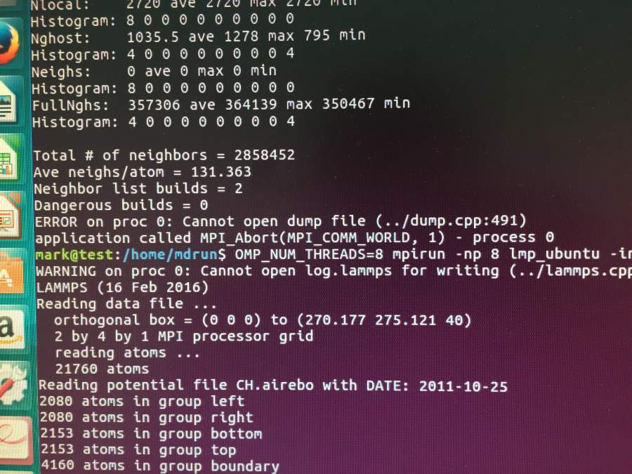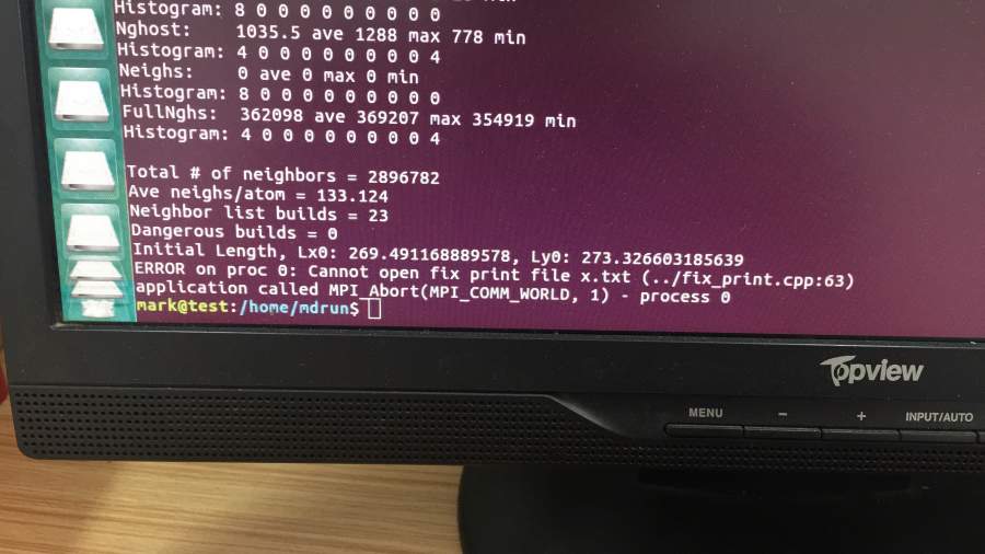 在ubuntu16.04并行lammps警告没有log文件,出现MPI_ABORT(MPI_COMM_WORLD,1)错误