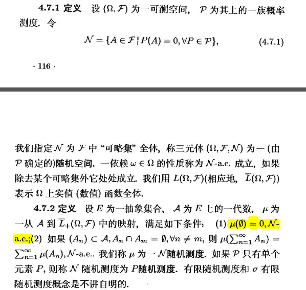 有关随机测度定义(如图),条件(1) μ(∅)=0 N-a.e.的, 不明白这个条件有什么意义,对于所有概率测度P,P(∅)=0,那么∅∈N,也就是说即使μ(∅)≠0也满足 μ(∅)=0 N-a.e., 这个条件对于μ(∅)没有约束啊 搜狗截图16年05月20日0207_1.png |