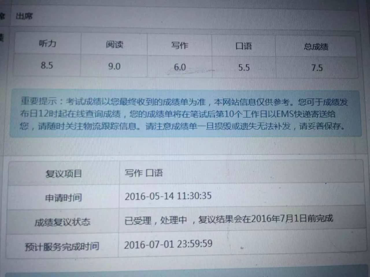 祝福。不过对于看的人,我想说除非手头富裕,时间紧。你可以复议。不然建议不要花钱复议了。照这样的的情况一般复议都不会通过。虽然楼主阅读听力很好,而且是真的很好。但和口语有关的主要是写作。这种写作分低的,想复议让口语提高分真心不容易。话说楼主这分偏得厉害啊。最后还是祝福啦。 发自小木虫Android客户端 |