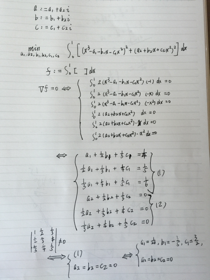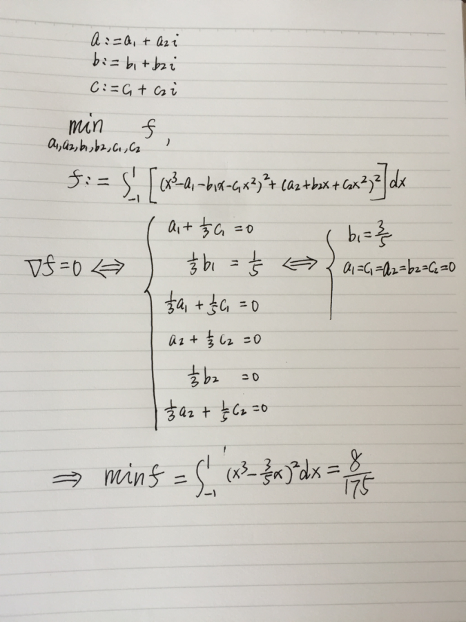 那一题是约束优化,所以需要复杂的技术。 这题是无约束优化,令梯度为0即可。 我有一点困惑是:若abc可取复数,则应当把实部虚部分开,化为6个实参数的无约束优化问题。 发自小木虫IOS客户端 |