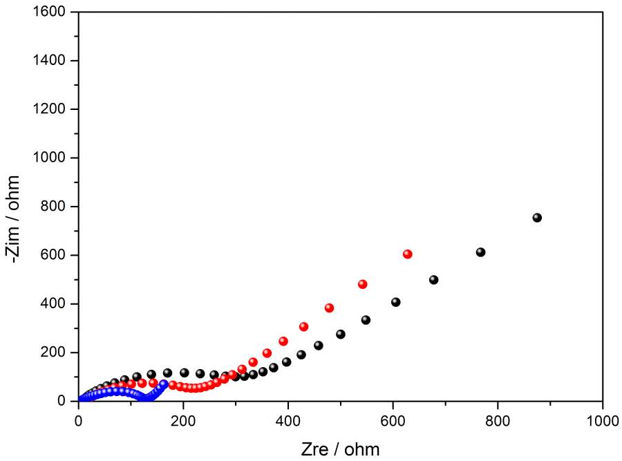 如图,测了三个样品的阻抗,测试程序完全一样,但是为什么三个样品在低频区的溶液扩散阻抗(后边的斜线部分)会差别这么大, 黑色线很长,而蓝色线很短。对阻抗谱不是很了解,希望得到大家的帮助,谢谢! Graph1.jpg |