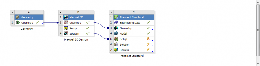 在仿真一个线圈在正弦电流激励下绕组的形变情况,已经在maxwell中将计算出了绕组在0~0.02s(每隔0.002s一个点)的电磁力分布,想把它导入transient structural 中进行瞬态结构场分析,但是导入之后各个时间点显示的绕组受力全是0. 大家有没有遇到过这种情况,该怎么解决瞬态电磁力导入瞬态结构场进行分析 结构关系.png |