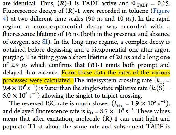 文献中材料荧光跃迁速率、系间穿越速率、反向系间穿越速率等都是通过瞬态荧光光谱的信息,经过进一步的计算得到的。我想知道的是怎么计算的?比如图中的一段论述,根据寿命直接计算得到了几个速率常数,Kr(S)这个我知道怎么算,但是Kisc, Krisc具体是怎么计算的,不是很明白啊,所以请各位多多指教,感激不尽! 捕获.JPG |