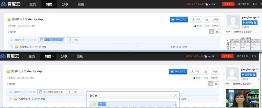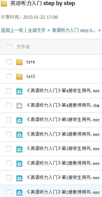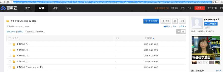 百度云用户 yangkangshi https://pan.baidu.com/share/home?uk=554090192#category/type=0 英语听力入门 Step by step 2000 链接 https://pan.baidu.com/s/1kT0zNYv ------------- 百度云用户.jpg |