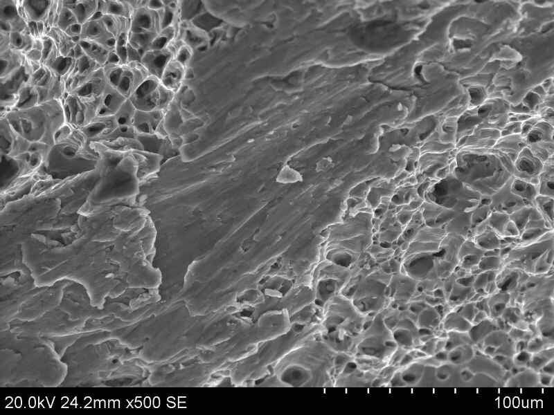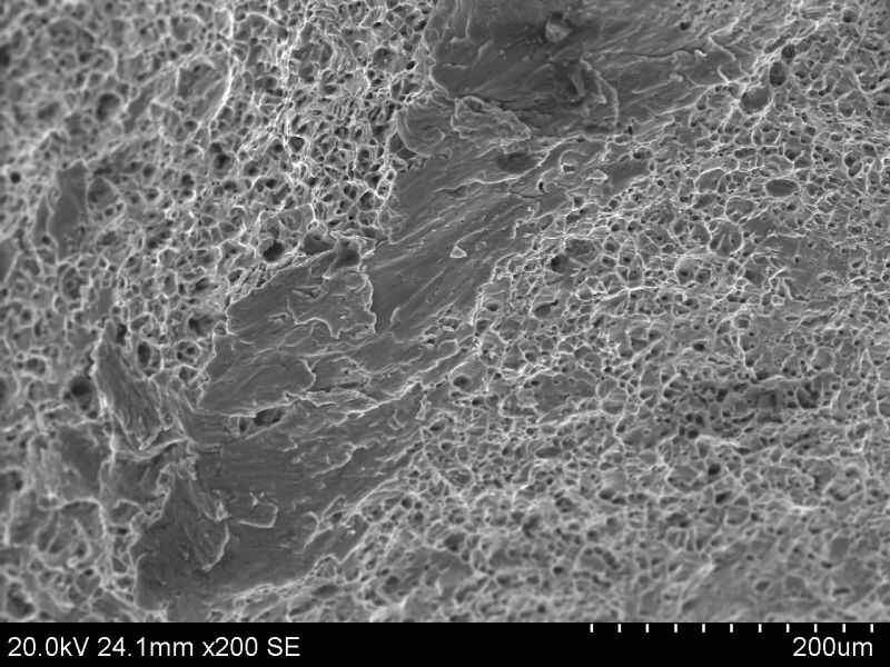 正常来说,铝合金拉伸断口sem应该就是韧窝特征,可是我做的拉伸断口出现了一些平滑的区域,如图所示,对其放大观察也是和韧窝截然不同的特征,不知道这个区域是什么?怎么形成的?求助虫友帮忙分析一下,非常感谢! 发自小木虫Android客户端 |