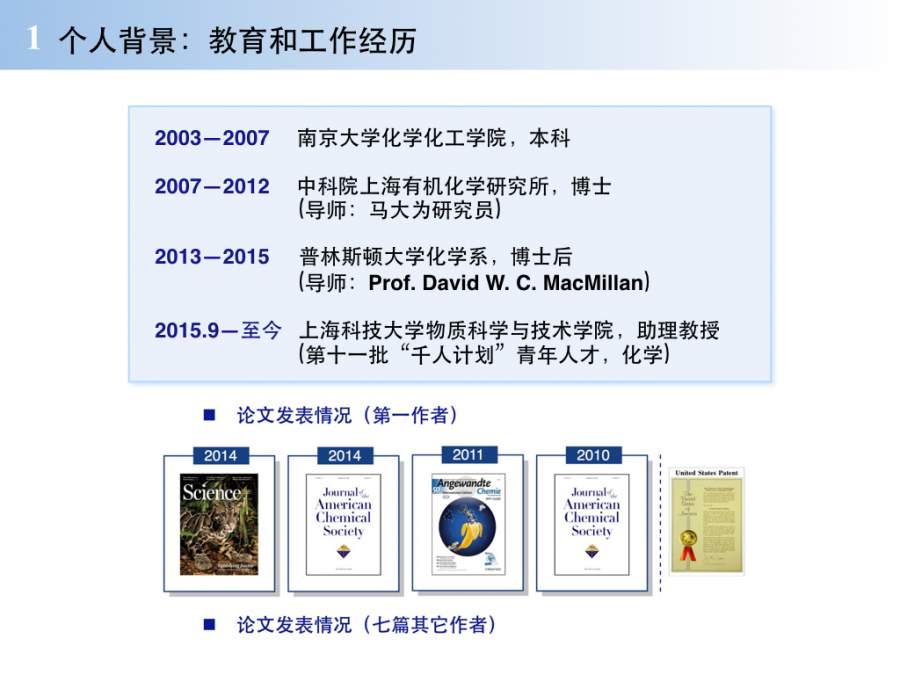 上科大左智伟课题组(青年千人)招收夏令营(考研、保研) 1.png 更加详细的个人简介可以参见:https://www.shanghaitech.edu. ... eople/1163.html 以及之前在小木虫发不过的消息(仅个人信息有效):https://muchong.com/bbs/viewthread.php?tid=8678983 主要研究方向:光催化方法学,天然产物全合成,化学生物学 2.png 3.png 小规模、高水平、国际化的研究型、创新型大学: 夏令营https://www.shanghaitech.edu.cn/notice/20160428/643.html 4.png 有志向从事有机化学且夏令营出众者,考研过国家线即可! 邮箱:[email]zhiweizuo@outlook.com[/email] [ Last edited by sally88814 on 2016-5-30 at 19:01 ] |