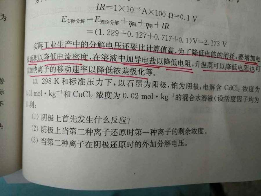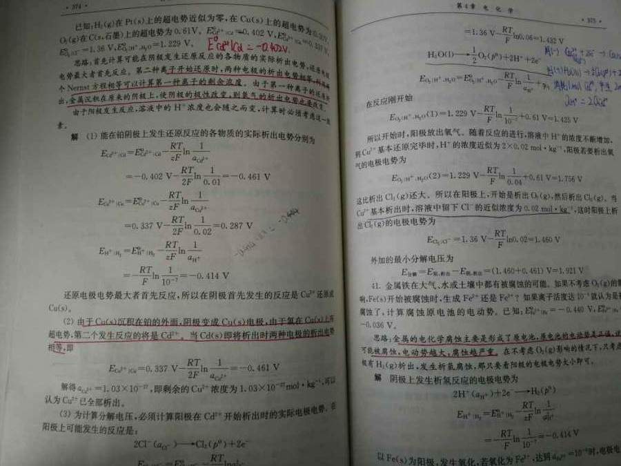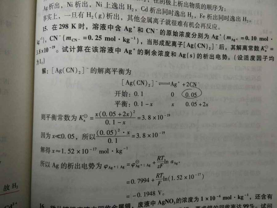 1.(第一二张图片),题意大意为电解CdCl2 0.01mol/kg,CuCl2 0.02mol/kg,先析出铜和氧气,不明白的是为什么铜析出时,溶液中的氯离子近似为0.02mol/kg. 2(第三张图片),CN负离子为什么是0.05,和题意不符 3。(第四张),小汞滴和大汞滴放在密闭烧杯内,小汞滴的饱和蒸汽压大于大汞滴蒸汽压,当大汞滴达到饱和时,小汞滴未达到饱和就要挥发从而凝聚在大汞滴上?这点不懂 4。关于气泡和液滴是凹凸液面的理解问题,圆不是对称的吗,其中半面是凸的,令半面不是凹的吗 5。相对吸附量的理解问题,符号我打不出来,下标2,上标1,2代表溶质,1代表溶剂,把溶剂的相对吸附量规定为零得到吉不斯吸附等温式,书上的推导过程中把界面移到两个面积相等的地方,我不太懂相对吸附量。只能放三张图片,好吧,汞滴问题我就不放了。 发自小木虫Android客户端 1.jpg 2.jpg 3.jpg [ Last edited by 冰点降温 on 2016-6-1 at 09:09 ] |