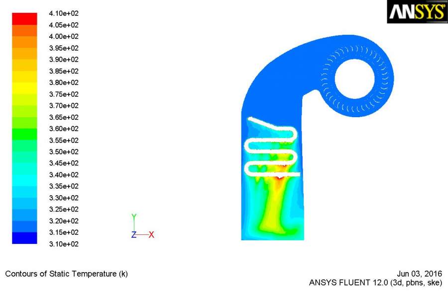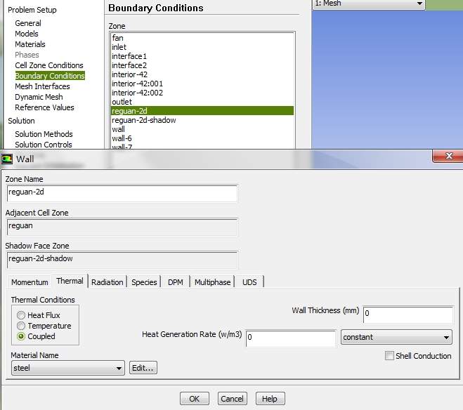 风扇强制加热管与空气对流换热 图1是速度云图 图2是结构图 图3是固体热源加热管的热源设置 图4是加热管耦合面设置 图5采用的压力速度耦合是默认的 (需要用couple吗?) 湍流模型是标准k-e模型 基于压力(非密度)求解的 图6是温度云图,基本符合实际 图7是 加热管表面温度分布(温度层次很明显,感觉不符合实际) 问题是 : 1.我的设置有没有问题 2.图7是不是有问题 请大家多多指导 谢谢 1.jpg 2.jpg 3.jpg 4.jpg 5.jpg 6.jpg 7.jpg@wuming524 |