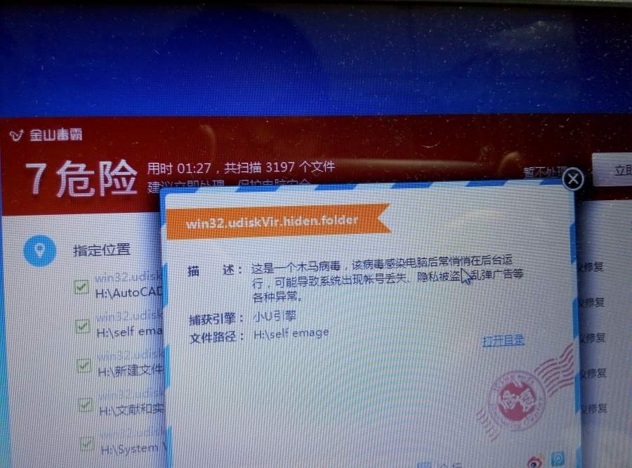 U盘拿去打印店打印东西,回来之后,U盘里的文件夹全部变成快捷方式,但是里面的文件都在。经金山毒霸查杀,提示是win32.udiskVir.hiden.folder病毒,但是处理之后,问题依然没有解决,求大神指点。 P60602-185647.jpg |