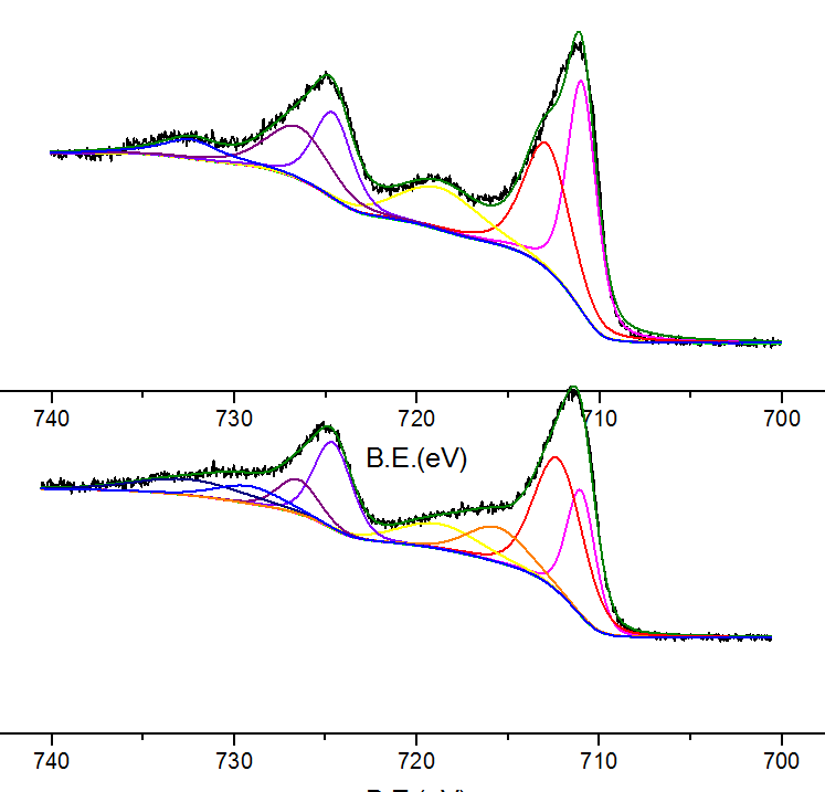 上图材料Fe是+3价,下图是材料经过处理后,我想表征下Fe的价态变化情况。但我下图可以分出来Fe2+的卫星峰(橘黄色和深蓝色),但是分不出来它的主峰(大约在709和715.5),请问这是什么原因呢?如果说Fe的价态没有变化,那为什么卫星峰能够分出来?。。。如果说变了,,,为什么主峰没有。。。请各位大神指教。。。 XPS Fe2p.png@guozl@zyhou |