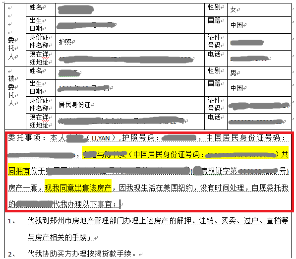 最近买二手房,业主在美国纽约,需要开个委托书,然后公证一下。业主说咨询律师,说美国那边开不了如下内容和格式的委托书,特别是前半部(红框里)存疑,请问在美国允许这样写不?大家可以看红框部分,特别是标黄的部分,房管局要求必须体现二人共有。 委托书.png |