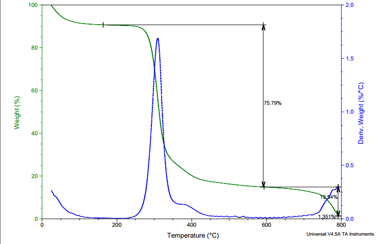 本人的实验是聚合物为稳定剂,硼氢化钠为还原剂制备纳米银溶胶,想看一下体系里银的含量,所以就冻干了做了个TGA,但是图跟想象的不太一样,不知道在600度开始分解的是什么东西,请做个的大神帮忙分析一下,万分感谢。
