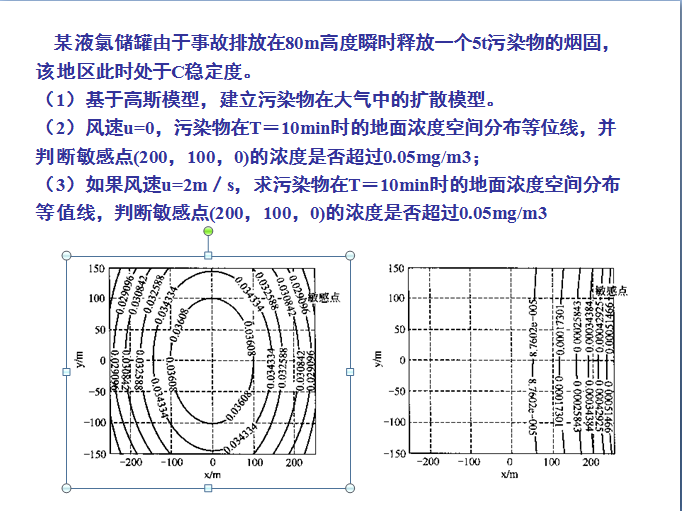 (2)风速u=0,污染物在T=10min时的地面浓度空间分布等位线,并判断敏感点(200,100,0)的浓度是否超过0.05mg/m3;