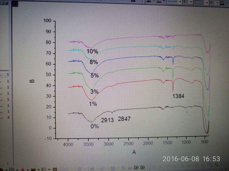 Zn(NO3)3和FeSO4(加入量为0%,1%,3%,5%,8%,10%)反应,加入NaOH,锌碱比1:2,各位大神们帮忙看看红外谱图 发自小木虫Android客户端 |