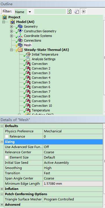 请教关于利用workbench模拟稳态下,Au电极传热的模拟(附件中名字写错了)。Au电极缠绕有70um的加热铜丝,然后Au电极连接导线,套在POM材料的壳子上,里面填充环氧树脂胶固定。整个电极有2cm插入到冰水浴中(2℃,对流换热系数100),其他暴露在空气中(2℃,对流换热系数12.5)