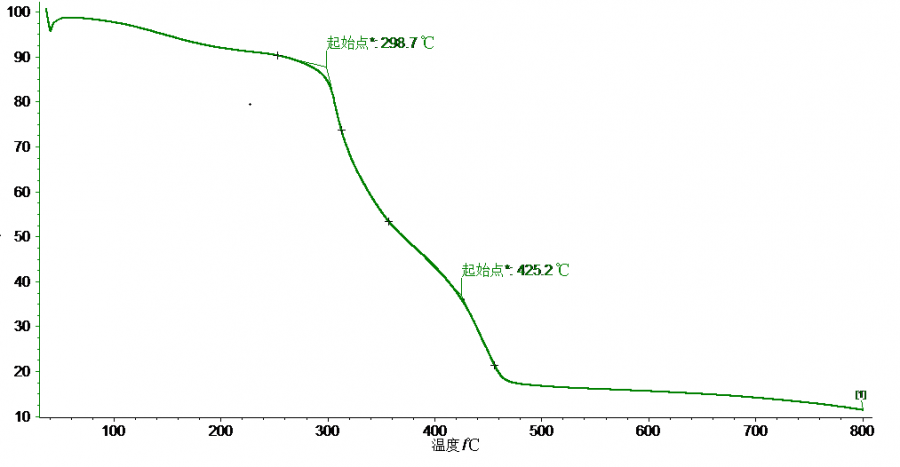 在298.7 摄氏度以下温度时失重缓慢,估计都是因为水汽等蒸发失重;超过了298.7摄氏度,材料本身开始剧烈失重,直至475摄氏度,失重速率再次放缓,直至最后的800摄氏度温度。