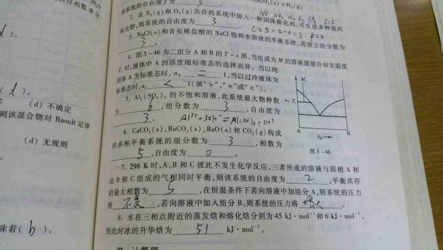 4、化学势的大小与标准态的选择无关。若以纯固体A为标准态时,α(A)=1(通常规定的标准态);当以过冷液体为标准态时(因过冷液体的化学势大于纯固体的化学势),则α(A)<1 7、⑴体系的组分数=3,此时体系有三个相(气、液、固),自由度f=3-3+2=2; ⑵当自由度为零时,最多共存的相为f=3-Φ+2=0,则Φ(max)=5; ⑶在三相共存的体系中,加入组分A,因原平衡体系就有A固体,故加入的A不会溶在溶液中,所以不会对系统上方的蒸气压产生影响,即不变 ⑷若向溶液中加入组分B,因B组分在溶液中的浓度增大,使得气相中B的含量增大,导致蒸气压增大。 |