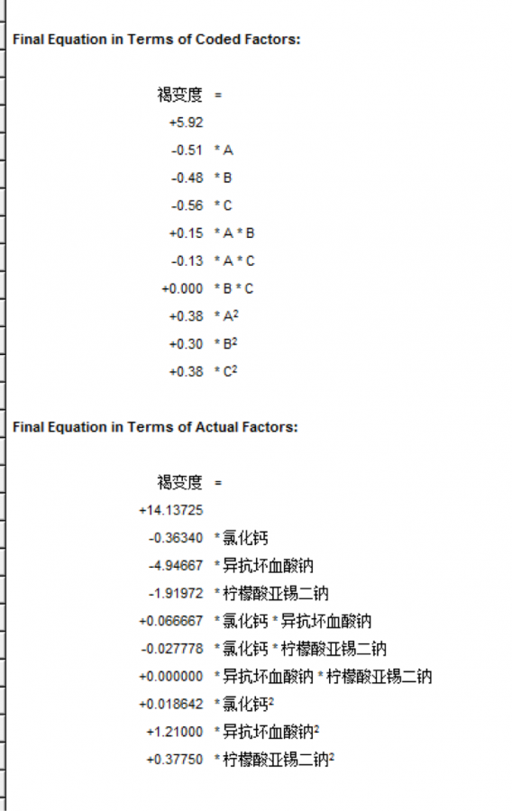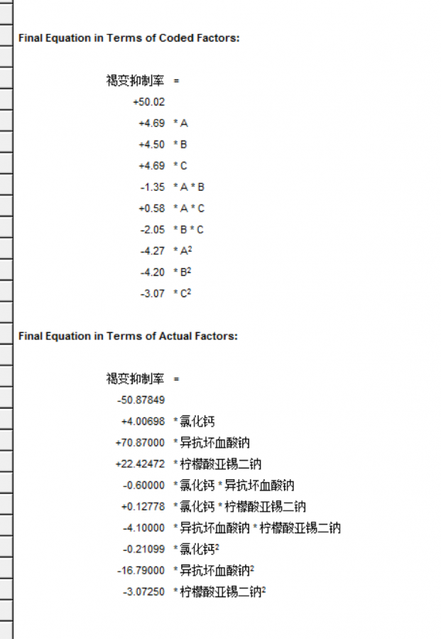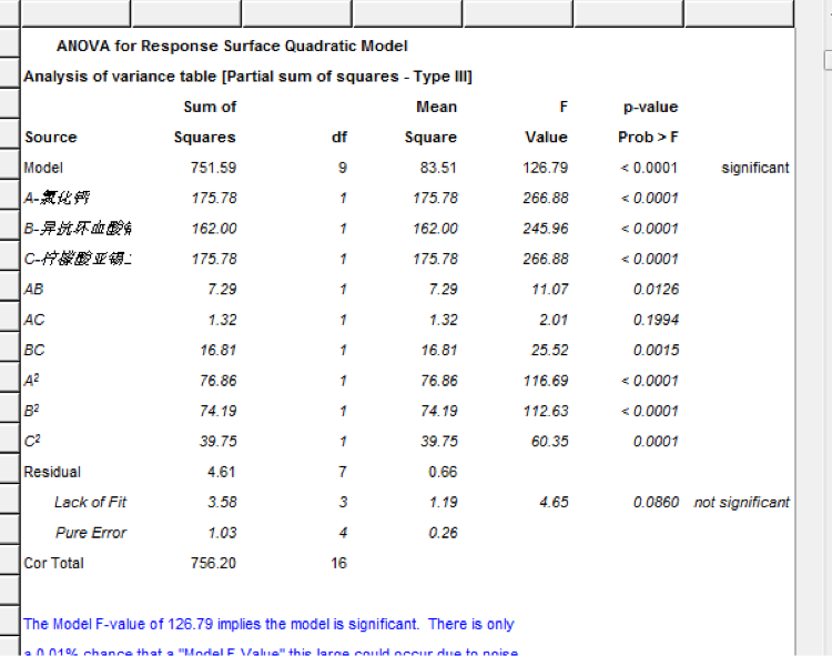 整个模型显著,失拟项不显著,ABC都显著,交互项有的显著有的不显著,模型来看结果不错,貌似我看不到你拟合出来的参数方程和最优值 发自小木虫Android客户端 |