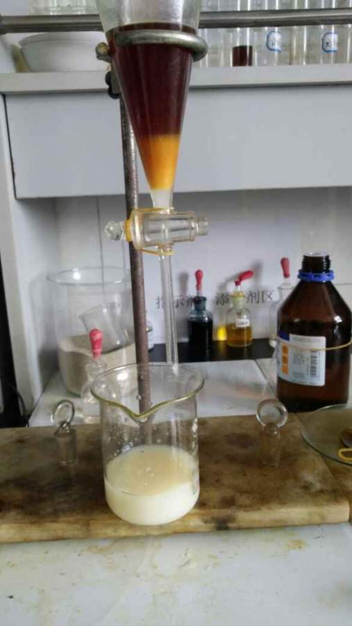 虫子们,我最近做原油蒸馏后的柴油脱硫,用双氧水氧化,然后油层用20%体积的甲醇水溶液萃取,得到了三相,水相为什么会是乳白色?