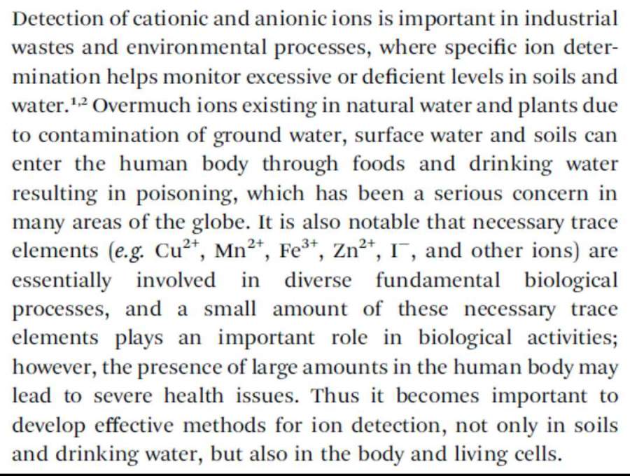 | 阴阳离子的测定对工业废弃物环境处理非常重要,它有助于监控土壤和水体中的某些特定离子,看它们是处于超标水平还是缺乏水平。由于地下水、地表水和土壤的污染而导致自然水体和植物体中某些离子的数量过多,这些过量的离子通过食物和饮用水进入人体而造成毒害,这在世界很多地方已成为一个严重的问题。另一个值得注意的情况是必需痕量元素(如铜……等),它们必然地参与到各种基本的生物学过程中,极小量时就可在生物活动中起重要的作用,但在人体中的数量一大,就会引起严重的健康问题。因此,研究出有效的测定不单是土壤中,饮用水中,还有人体中,活细胞中的离子的方法就显得非常重要。 |