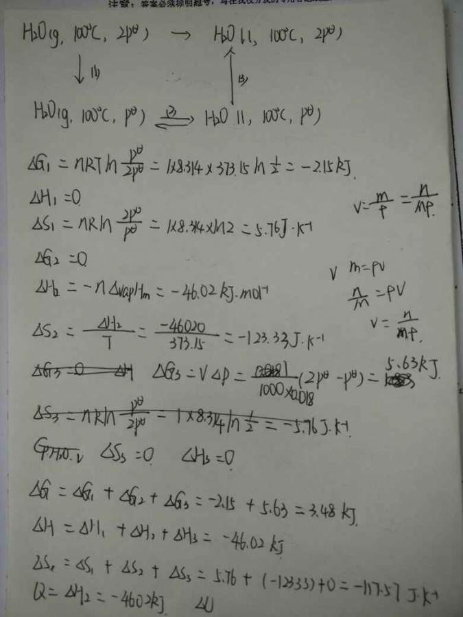 如题,既然题目已经给了密度,△G应该就应该用v△p计算,不知道熵和晗是不是为零。还有功的求算,简单pvT变化的热应该<相变热,过程热直接等于相变热了,然后△H=γ△U,求出内能变,减去Q,就是功了,不知道这样的思路对不对,这还是有一个问题,就是相变不能用△H=γ△U了吧,好多纠结的问题。求解答 发自小木虫Android客户端 |