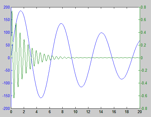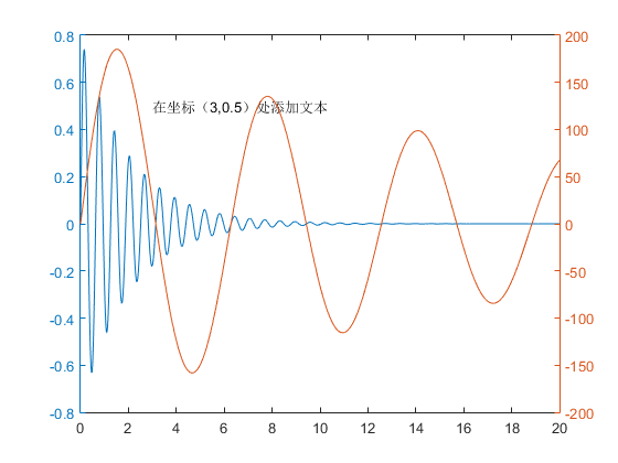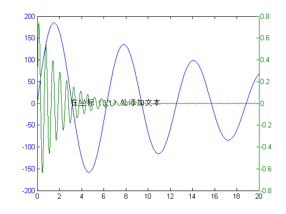 x = 0:0.01:20; y1 = 200*exp(-0.05*x).*sin(x); y2 = 0.8*exp(-0.5*x).*sin(10*x); [AX,H1,H2] = plotyy(x,y1,x,y2,'plot'); 如何用右标的坐标系来确定文本的放置位置,比如在(3,1)的地方添加个文本。 0S_QJ3(O3OS{}X4Y069V@9N.png |
