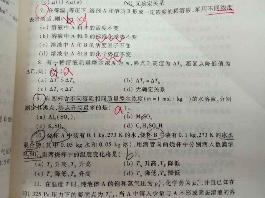 10、烧杯A滴加浓硫酸,因放热,温度升高;烧杯B中滴加浓硫酸,因放热使极少量的冰熔化,又因形成硫酸溶液,致使水的凝固点降低,导致部分冰溶解,体系温度下降。选b 9、依据依数性来理解。1mol物质谁电离出的离子多,沸点升高的就多。选a 8、比较水的Kf与Kb的大小,水的Kf=1.86,Kb=0.51。选a 7、根据化学势的表达式来理解,同一体系其化学势的值不因标准态的选择而发生变化,但标准态化学势的大小与标准态的选择有关。在理想稀溶液中溶质遵循亨利定律,它有三种不同表达式,选择不同的浓度来表达,就是选择不同的标准态。因x(B)≠m(B)/m°≠c(B)/c°,所以三者的标准态化学势是不相等的。选d 5、因(dμ/dT)p=-S,故温度降低,化学势升高。选c 4、比较两烧杯中水的化学势,或者是两者的饱和蒸汽压,纯水的饱和蒸汽压大于糖水的,对于糖水而言已达平衡,但对纯水尚未饱和,故烧杯A中纯水不断挥发,在烧杯B中不断凝结。选b 2、对于理想液体混合物,易挥发组分在气相中的含量大于液相中含量,根据题意可知A为易挥发组分,所以A在气相中的含量应大于0.5。也可以通过拉乌尔定律计算。选c |