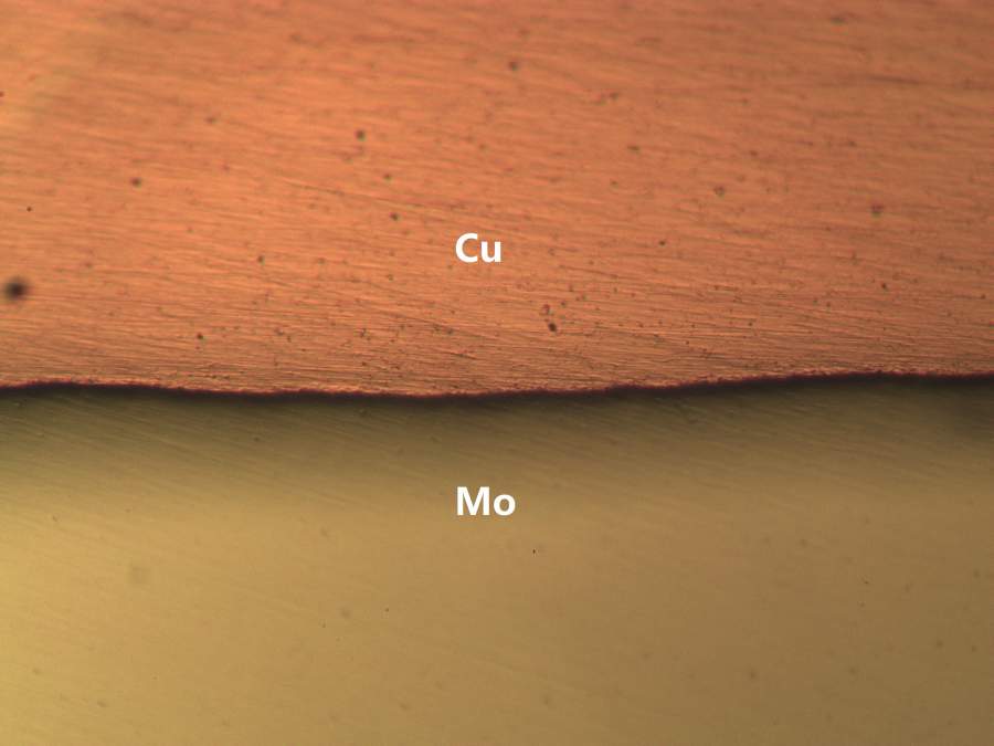 【潜水】阿鲁凡 2016/6/22 13:02:59 新手,来木虫求助。 这是我这两天弄的一个样,铜钼复合板,在机械磨抛过程中,钼层总是会鼓起来,导致铜钼界面处呈黑线状看不清,想请教一下各位大神这个具体该怎么处理比较好?该图是200倍下拍的。 Shot_201606221111270744.jpg |