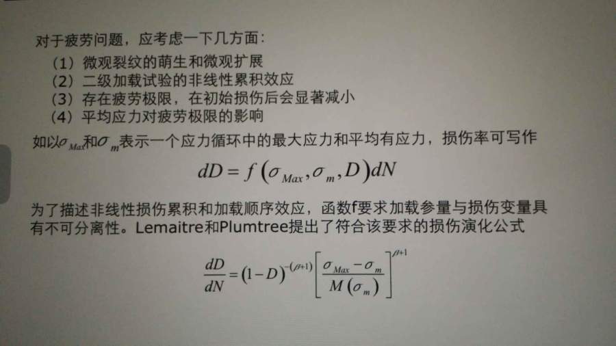 根据文献记载这个公式是Lemaitre和Plumtree提出的疲劳损伤非线性演化方程,可是我没有找到公式的推导过程相关文献。有没有大神可以帮忙推导一下,或者有相关的公式来源的文献。谢谢~ps:我是损伤力学小白一枚 发自小木虫Android客户端 |