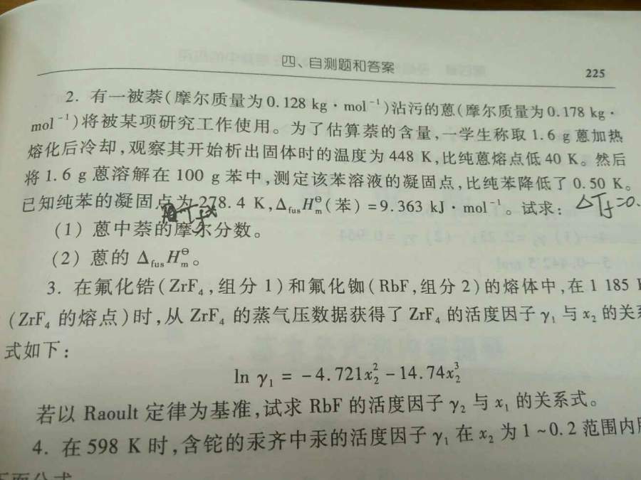 1、计算苯的凝固点常数Kf=5.368 K·kg/mol 2、计算1.6g混合物的溶于100g苯中的平均质量摩尔浓度m=ΔT/Kf=0.0931mol/kg 3、计算1.6g混合物的平均质量M=m/n=1.6/(0.1*0.0931)=172g/mol 4、计算混合物中萘的物质的量分数x=0.10 5、计算蒽的熔化热lΔH=4787J/mol 公式(4-11-5)在179页 (若混合物中萘的物质的量分数x=0.16,则蒽的熔化热lΔH=7923J/mol) 步骤大致如此,计算不出书上所给的数据。可能提供的数据有误。 |