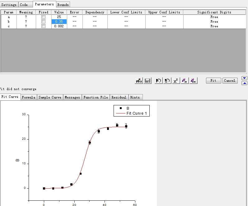 用origin8.0自定义非线性拟合微生物生长曲线,可是到“NLFit”这一步,输入“Parameters”的“Value”后,进行一次拟合,总出现“Fit did not converge”,“Eerror”项也没有变动,最后输出的文本框中也没有拟合度R的平方值,有没有哪位知道问题出在哪里?在此谢过! 1.jpg 2.jpg |