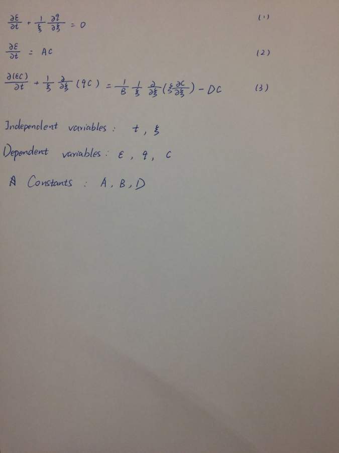 工科生,主要做数值模拟。遇到一个有流动,反应和扩散耦合在一起的偏微分方程组的问题。已经得到了数值模拟的结果,但是需要和理论解进行对比。这个方程组是在极坐标的参考系下写成的,一共有两个自变量,三个因变量。求组里数学大神帮忙看看怎么把这个偏微分变成常微分??如果有进一步求解的思路就更好了!新人一枚,无以为报!希望大神们能帮帮忙!先谢谢啦~ 方程组如图: image1.JPG |