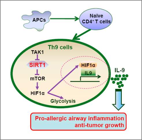 2016年6月14日,国际权威学术期刊Immunity在线发表了北京师范大学刘光伟教授领导团队的研究成果“Histone deacetylase SIRT1 negatively regulates the differentiation of interleukin-9-producing CD4+T cells”(组蛋白去乙酰化酶SIRT1负性调控Th9细胞分化)。论文链接:http://www.cell.com/immunity/fulltext/S1074-7613(16)30163-7。 该研究揭示了SIRT1在Th9细胞分化的调控效应和机制,为探讨Th9细胞相关哮喘和肿瘤疾病的发病机理及靶向治疗研究奠定了实验与技术基础。该研究得到了国家自然科学基金(项目资助号:81273201、31171407)等的资助。 生物能量代谢变化可以调控CD4+T细胞分化为不同的亚群并在临床免疫相关疾病中发挥调控作用。以往研究已经证实,Th1、Th2和Th17细胞主要依赖于糖代谢调控,而调节性T(regulatory T;Treg)细胞分化主要依赖于脂代谢调控,但关于Th9细胞亚群代谢调控效应和机制尚未进行揭示。 刘光伟教授的研究团队通过深入分析Th9细胞在过敏性气道炎症和肿瘤中的代谢调控机制,发现组蛋白去乙酰化酶SIRT1可以抑制Th9细胞分化并且在抗肿瘤免疫和过敏性气道炎症疾病中发挥重要调控作用,而且这一调控作用主要是由mTOR-缺氧诱导因子1α(HIF1α)信号介导的(图1),从而揭示了SIRT1-mTOR-HIF1α信号途径结合糖酵解代谢机制在诱导Th9细胞分化中的作用,为临床干预Th9细胞相关免疫疾病的代谢调控策略研究提供了实验依据。 SIRT1抑制Th9细胞分化并调节Th9细胞相关疾病 |