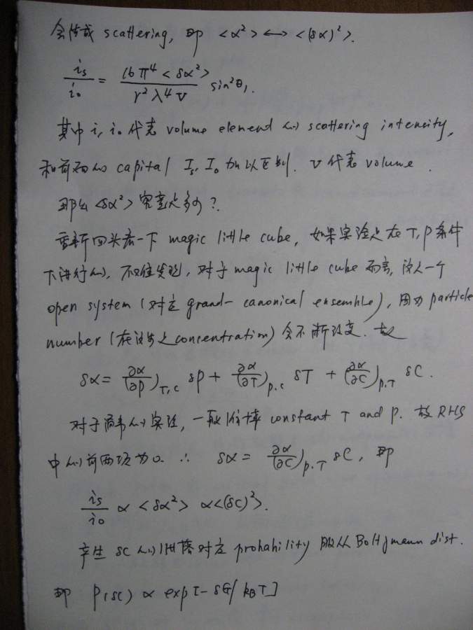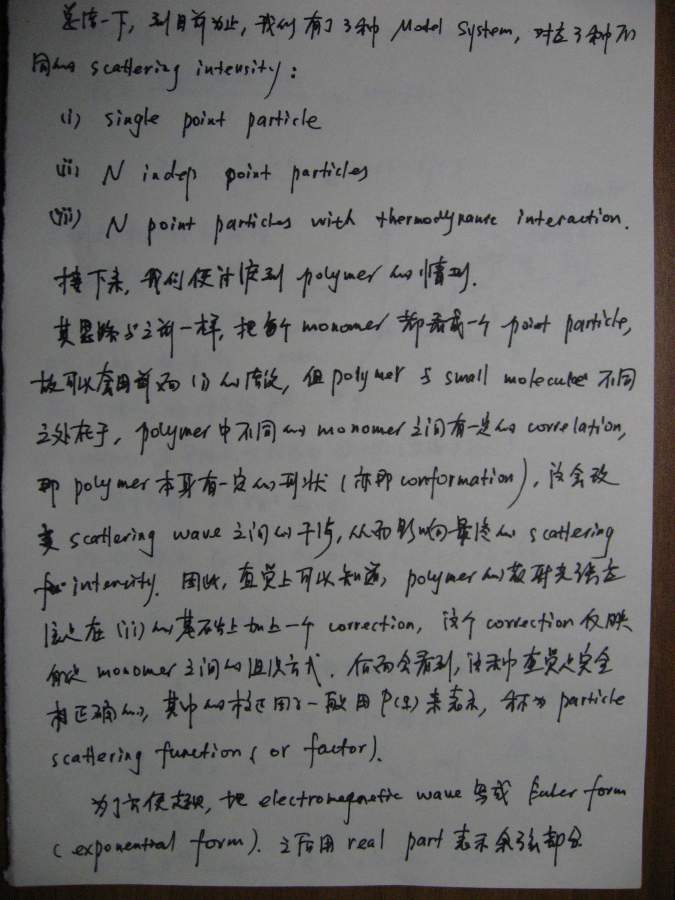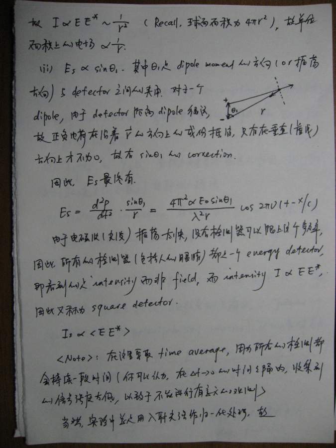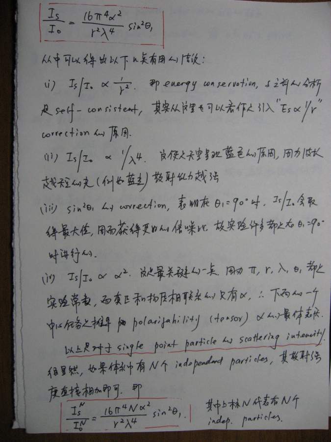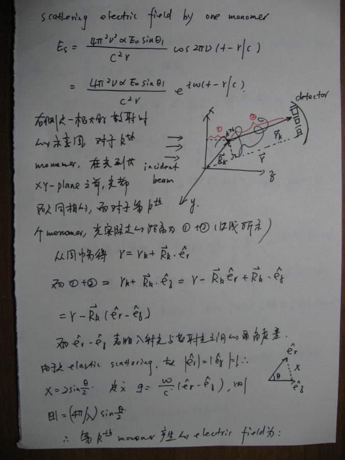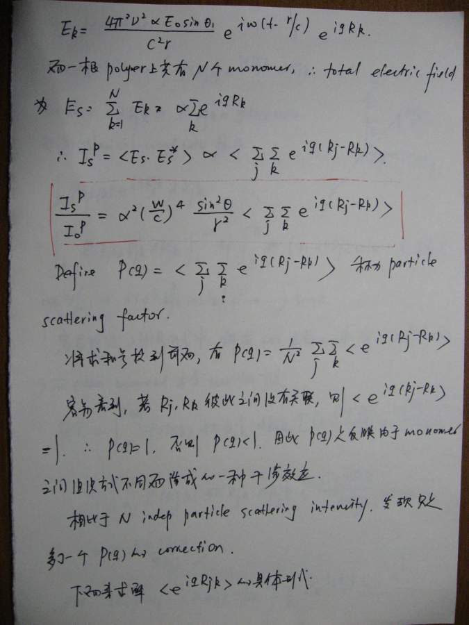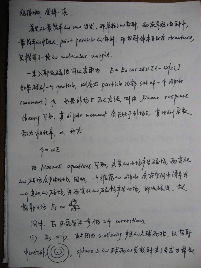 本文是之前(很久很久之前![]() )一个帖子的延续(http://muchong.com/bbs/viewthread.php?tid=6273829),当时想讲讲散射理论,但是因为种种原因只开了个头,但没有继续下去,许多年后的一天(也就是今天!),同样是因为种种原因,我还是希望能把这个帖子补充完整,于是就有了本文。考虑到符号和书写的方便,我还是决定纯手写,这意味着可能充斥着大量的书写错误,还请谨慎阅读。 其实散射理论可以从不同的角度切入,既可以从经典(电磁波)理论入手,也可以从比较现代的方案(比如量子力学)讲述,各有特点。从现代的角度(比如直接从density operator出发)的优点是简洁明了,但比较抽象,不太容易为初学者所掌握。我原来在组内讲过一次,效果不太好,所以这次我决定从classical approach出发,这种讲法的特点就是比较繁琐,但每一步的演进都清晰无比,让你一步步看到,carrier wave(electromagnetic wave)是如何消失的,最终只剩下correlation function,或许掌握了classical treatment之后,再去看modern approach就会比较容易。 这份讲义只涉了静态光散射(其实也没有讲完),我以后会把其他部分陆续补完,会一直延伸到动态光散射,最后会和一些具体的应用结合起来,比如kinetics of phase transition。我在这里并没有特别的区分laser/x-ray/neutron,因为在我看来,所有的散射都是一样的,差别仅在于(1)wavelength(2)contrast,当把这两部分的影响因素拿掉以后,所有的structure factor都是一样的,都是density-density correlation function,因此从原理上来讲,不同的散射方法没有本质的区别。同时再这里,我也没有特别区分散射和衍射,因为二者所用的基本原理也是一样的,只不过衍射是针对orderd system,因此scattering law应用之后,会有更多的规律性的结论,而散射通常针对disordered system,目的就在于从无序中寻找有序的结构。结构在某种意义上就是相互作用(或者说是potential),因为interaction会造成一种特定的structure,所以这二者在某种范畴内,是等价的。 有问题欢迎提出来,回答问题也是对自己的一种提高 ![]() ![]() ============================================================================================ IMG_0002.JPG IMG_0003.JPG IMG_0004.JPG IMG_0005.JPG IMG_0007.JPG IMG_0008.JPG IMG_0009.JPG IMG_0010.JPG IMG_0011.JPG IMG_0012.JPG IMG_0013.JPG IMG_0014.JPG IMG_0015.JPG IMG_0016.JPG IMG_0017.JPG IMG_0018.JPG |
