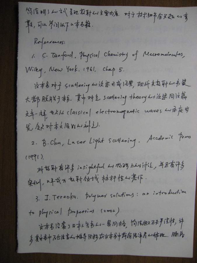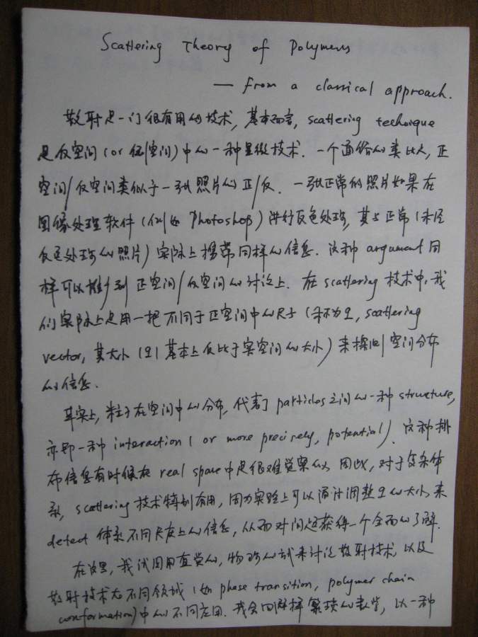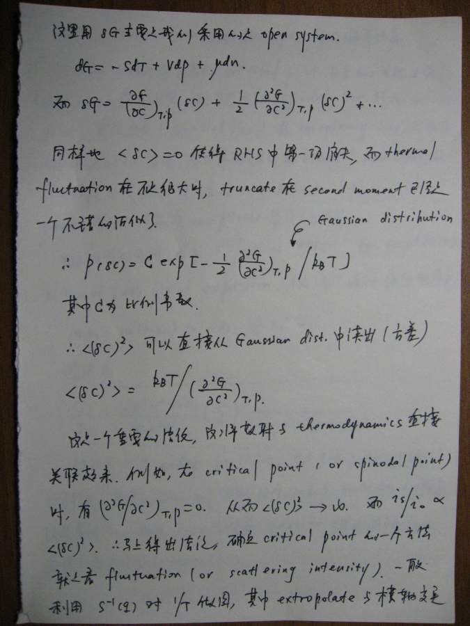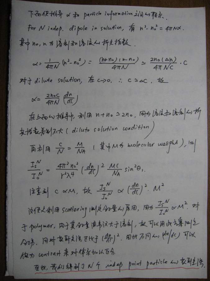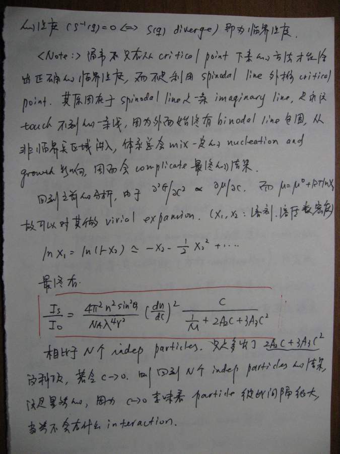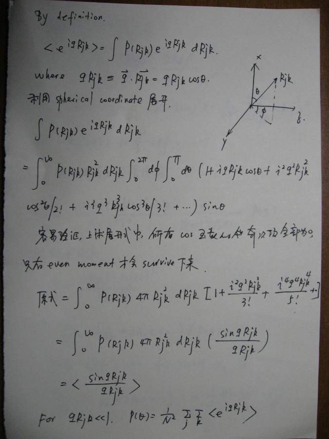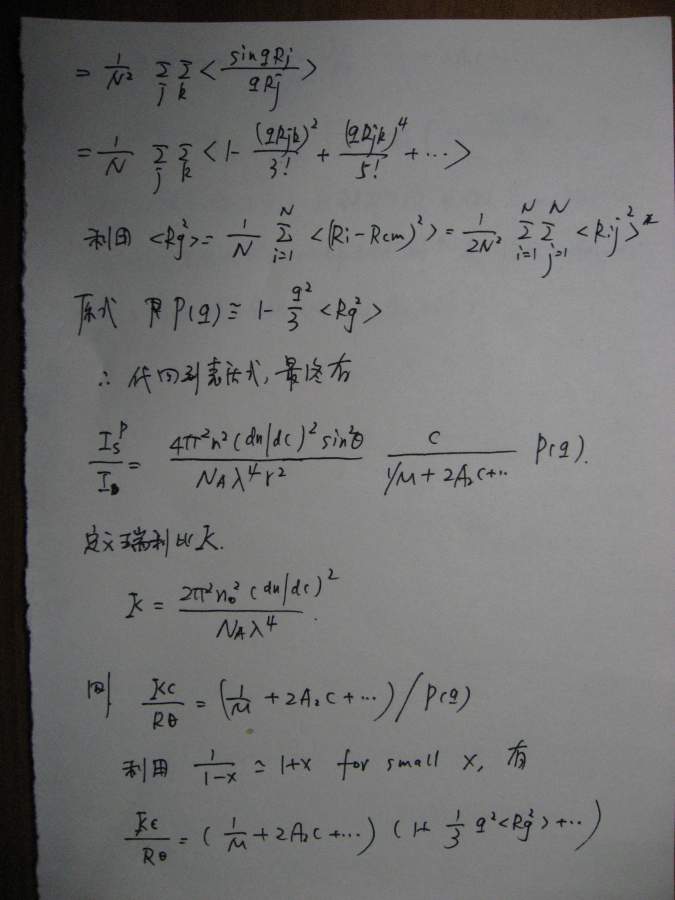 本文是之前(很久很久之前![]() )一个帖子的延续(http://muchong.com/bbs/viewthread.php?tid=6273829),当时想讲讲散射理论,但是因为种种原因只开了个头,但没有继续下去,许多年后的一天(也就是今天!),同样是因为种种原因,我还是希望能把这个帖子补充完整,于是就有了本文。考虑到符号和书写的方便,我还是决定纯手写,这意味着可能充斥着大量的书写错误,还请谨慎阅读。 其实散射理论可以从不同的角度切入,既可以从经典(电磁波)理论入手,也可以从比较现代的方案(比如量子力学)讲述,各有特点。从现代的角度(比如直接从density operator出发)的优点是简洁明了,但比较抽象,不太容易为初学者所掌握。我原来在组内讲过一次,效果不太好,所以这次我决定从classical approach出发,这种讲法的特点就是比较繁琐,但每一步的演进都清晰无比,让你一步步看到,carrier wave(electromagnetic wave)是如何消失的,最终只剩下correlation function,或许掌握了classical treatment之后,再去看modern approach就会比较容易。 这份讲义只涉了静态光散射(其实也没有讲完),我以后会把其他部分陆续补完,会一直延伸到动态光散射,最后会和一些具体的应用结合起来,比如kinetics of phase transition。我在这里并没有特别的区分laser/x-ray/neutron,因为在我看来,所有的散射都是一样的,差别仅在于(1)wavelength(2)contrast,当把这两部分的影响因素拿掉以后,所有的structure factor都是一样的,都是density-density correlation function,因此从原理上来讲,不同的散射方法没有本质的区别。同时再这里,我也没有特别区分散射和衍射,因为二者所用的基本原理也是一样的,只不过衍射是针对orderd system,因此scattering law应用之后,会有更多的规律性的结论,而散射通常针对disordered system,目的就在于从无序中寻找有序的结构。结构在某种意义上就是相互作用(或者说是potential),因为interaction会造成一种特定的structure,所以这二者在某种范畴内,是等价的。 有问题欢迎提出来,回答问题也是对自己的一种提高 ![]() ![]() ============================================================================================ IMG_0002.JPG IMG_0003.JPG IMG_0004.JPG IMG_0005.JPG IMG_0007.JPG IMG_0008.JPG IMG_0009.JPG IMG_0010.JPG IMG_0011.JPG IMG_0012.JPG IMG_0013.JPG IMG_0014.JPG IMG_0015.JPG IMG_0016.JPG IMG_0017.JPG IMG_0018.JPG |