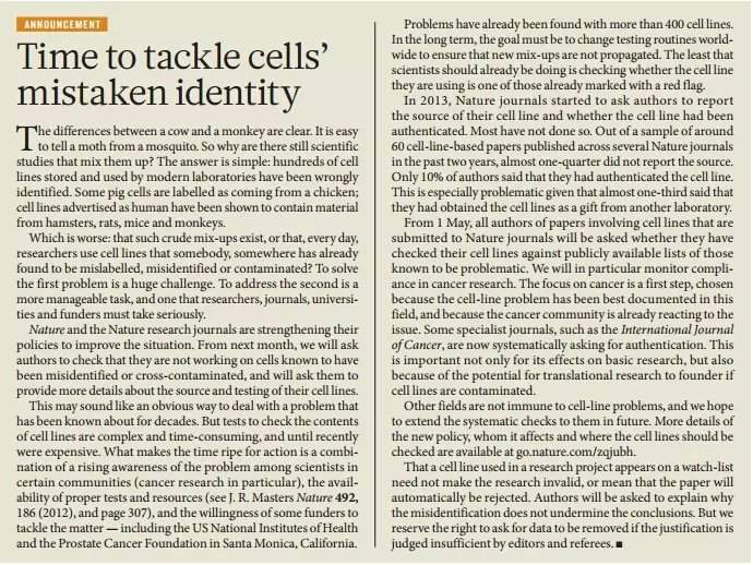 从2015年5月起,Nature将审查投稿者论文中所用的细胞系 已有1人参与