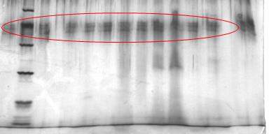 求助:小硕一枚,一不小心走上了生物化学结合的不归路,现在有点走不下去了,求指点 !!图中泳道除了第一个是Marker,其余全是纯的加完DTT的1倍上样液,不含蛋白,但是染出来在66kD的地方还是有齐整的二条细带,照理说纯的1*B跑出来的带应该是干净的。换过银染用的所有试剂,还是有,只有不加DTT时候没有66kD处的杂带的。求指点小木虫上传.jpg |