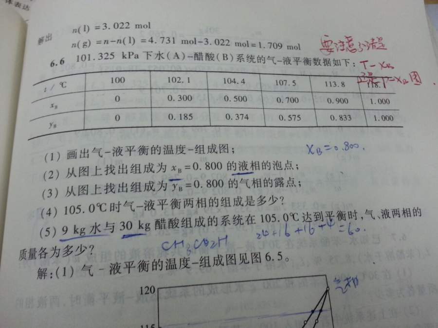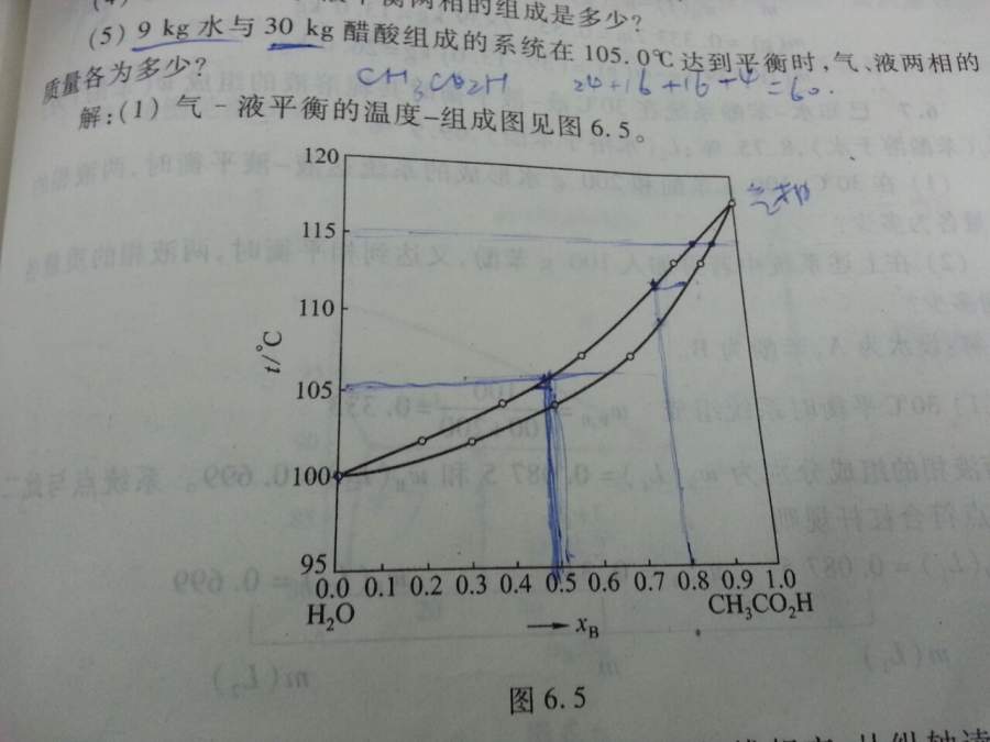 两者均可以。 若直接使用相图的数据最佳 1、先把物系的物系点由质量转化为物质的量。n(H2O)=0.5kmol,n(HAc)=0.5kmol 其x(HAc)=0.5 2、根据所给相图找到总组成x(HAc)=0.5,在105°C对应的相点,假设此条件下液相组成x(HAc)=0.54 气相组成 y(HAc)=0.42 3、物料守恒 n(g)+n(l)=1kmol (0.50-0.42) n(g)=(0.54-0.50)n(l) 解得:n(g)=0.33kmol,n(l)=0.67kmol 4、将物质的量转化为质量 m(g)=60*0.42*0.33+18*(1-0.42)*0.33=11.8kg m(l)=60*0.54.*0.67+18*(1-0.54)*0.67=27.2kg (或m(l)=m-m(l)=39-11.8=27.2 kg) 若要把相图中的物质的量分数转化为质量分数,假设此条件下液相组成x(HAc)=0.54 气相组成 y(HAc)=0.42 w(HAc)%=0.5*60/(0.5*60+0.5*18)=0.77 (物系点w(HAc)%=30/(9+30)=0.77) 气相组成 w(HAc)%=0.42*60/(0.42*60+0.58*18)=0.71 液相组成 w(HAc)%=0.54*60/(0.54*60+0.46*18)=0.80 解得: m(g)=13kg m(l)=26kg 因为精度不同转化后计算的误差大小不同。 |