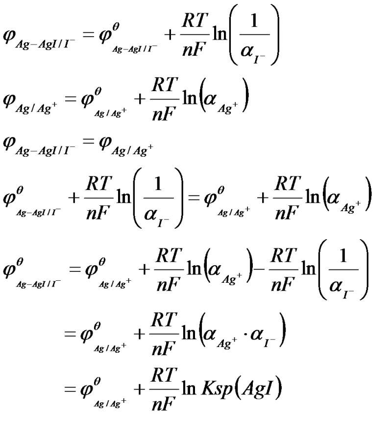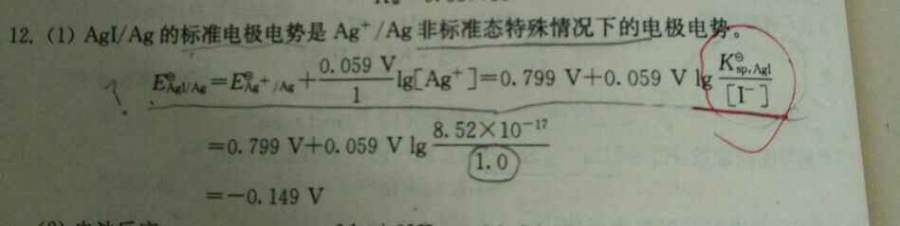 对于该体系的电极电势均可以根据附图上面的两个关系式中的任意一个进行计算,相当于选用了不同的标准来处理。第一个表示I-的浓度大小导致Ag+的变化,致使Ag/Ag+电对电极电势发生变化;第二个直接通过Ag+来计算Ag/Ag+电对电极电势发生变化。两个标准不同,但计算结果相同。推导过程如附图所示。这样可能好理解一些。 Ag-AgI标准电极电势的应用.jpg |