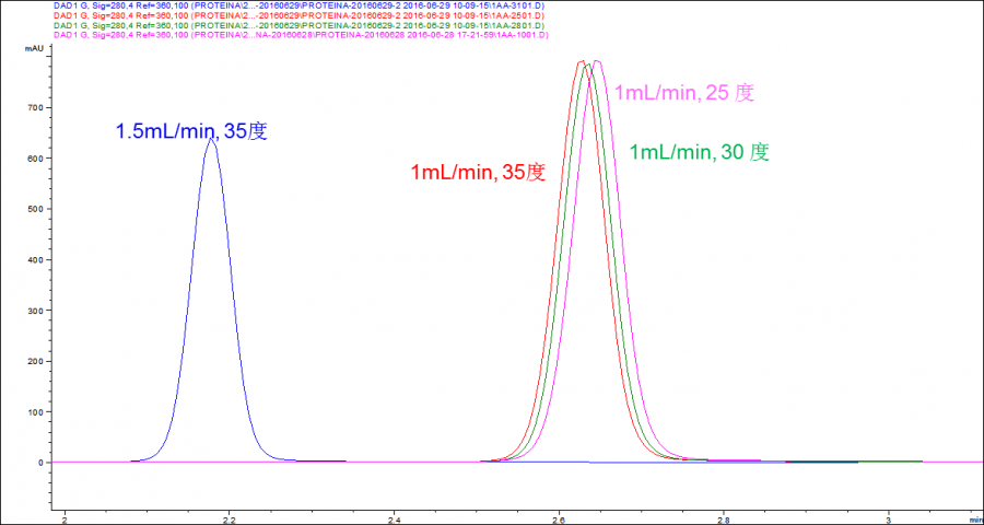 Pro A柱子测蛋白浓度,平衡液0.2 M PB,pH6.75,洗脱液0.2 M PB,pH3.0。目前时间是6.5 min。想缩短分析时间,故尝试加大流速和提高柱温箱温度以提前峰保留时间,如下图。1 mL/min流速,不管25度、30度、35度,保留时间都差不多。流速提高至1.5 mL/min时,保留时间明显提前,但是峰面积明显减小!下一步怎么办? 可否提高洗脱液盐浓度? 图片1.png |