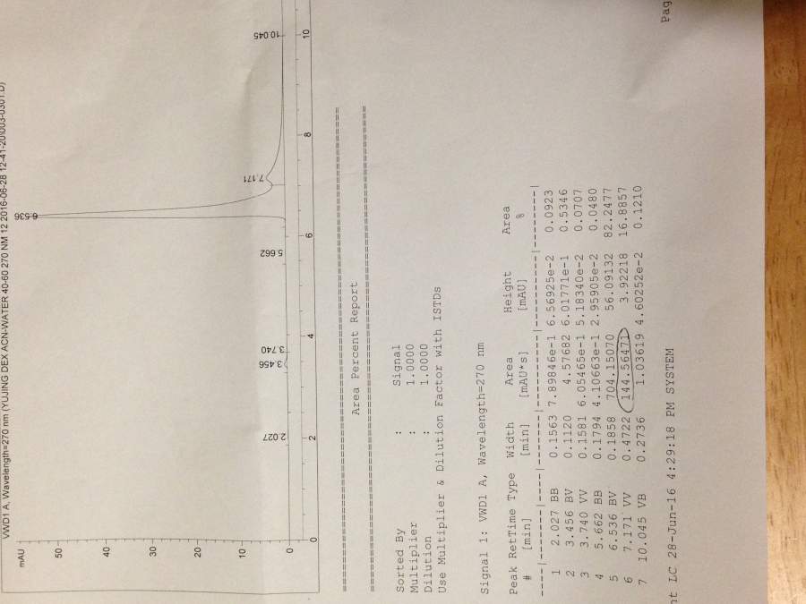 最近刚接触HPLC,目前在用HPLC分析地塞米松,采用实验室已经建立的方法(前人验证很多次,都没问题),用C18柱子,流动相为乙腈/水(40/60),但是我现在的得到的谱图如下: 地塞米松在6.5分钟出峰,峰面积704,旁边有一个杂峰,面积为144。 地塞米松购自Sigma,纯度应该没有问题。刚开始怀疑柱子污染了,换了新的C18柱子,但是还是相同的结果。 后来固定了地塞米松的浓度,改变了一系列条件: 更改乙腈/水比例,70/30,50/50,40/60,30/70,出峰时间有变化,谱图形状不变,两个峰面积的比例也不变。 更改紫外检测波长, 240,254,270,谱图形状不变,两个峰面积的比例也不变。 更改进样量,5uL,20uL,40uL,两个峰面积都减小,但两个峰面积的比例不变。 大家看谱图,那个小的峰算杂质峰还是算拖尾呢? 对HPLC是新手,现在不知道该如何改进了。在此,请教各位高手,非常感谢。@鸭绿江畔@superyeast@wyy080214@klicking@学术巨星 |