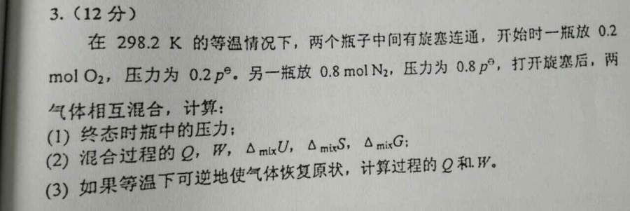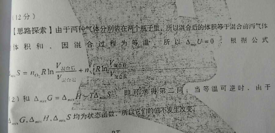1,觉得这题有点问题,没说明是理想气体,只有理想气体定温才能内能不变,热等于功 2, 混合熵变如果用体积比只要理想气体等温条件就可以了吧。如果用摩尔比,用了阿玛格分体积定律,条件为理想气体,等温等压吧 发自小木虫Android客户端 |