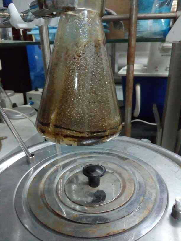 油浴130℃,蒸水和焦油混合物,已经正蒸出清油,但水还是没有完全蒸出。(水与焦油大约体积1:1,一共50ml左右) @liaifeng @NGJ889KWWC; 发自小木虫Android客户端 |