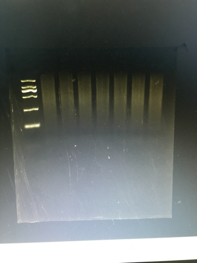 是RNA的话,看结果应该出现降解了,被RNase污染,正常的话会出现几条明显的带,就是核糖体RNA比较亮。建议,将所有的东西都按要求严格处理,严格操作步骤。祝 顺利!...
