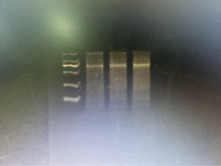 是RNA的话,看结果应该出现降解了,被RNase污染,正常的话会出现几条明显的带,就是核糖体RNA比较亮。建议,将所有的东西都按要求严格处理,严格操作步骤。祝 顺利!